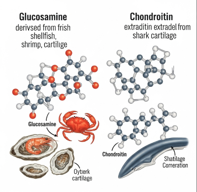 글루코사민은 굴, 새우, 게 등 갑각류의 키틴을 분해한 성분이며, 콘드로이틴은 상어 연골에서 추출한 점액질 성분입니다. 이 두 성분은 연골 구성의 핵심 요소로 오랜 검증을 거쳐 가장 무난하게 추천할 수 있는 영양제입니다.